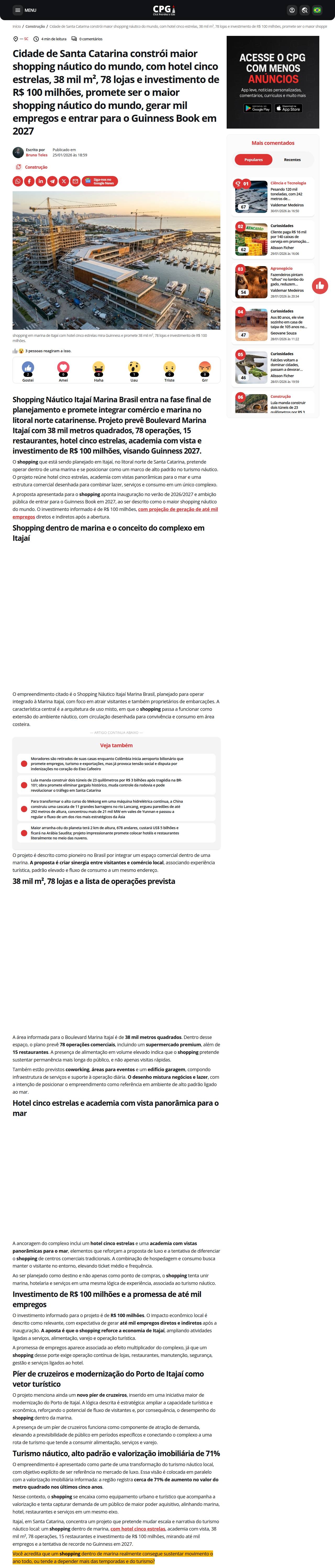 Cidade de Santa Catarina constrói maior shopping náutico do mundo, com hotel cinco estrelas, 38 mil m², 78 lojas e investimento de R$ 100 milhões, pro