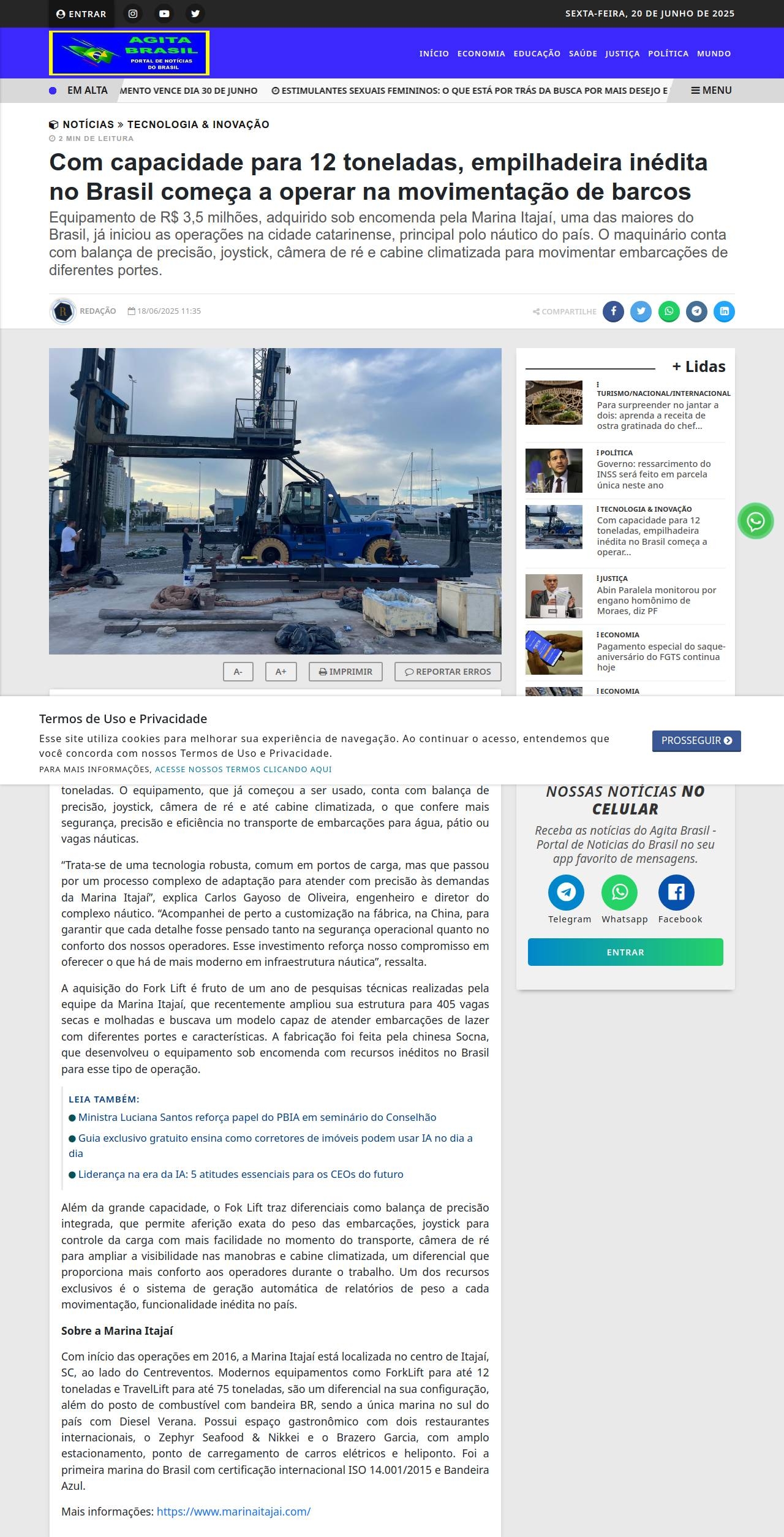 Com capacidade para 12 toneladas, empilhadeira inédita no Brasil começa a operar na movimentação de barcos - Agita Brasil - Portal de Noticias do Bras
