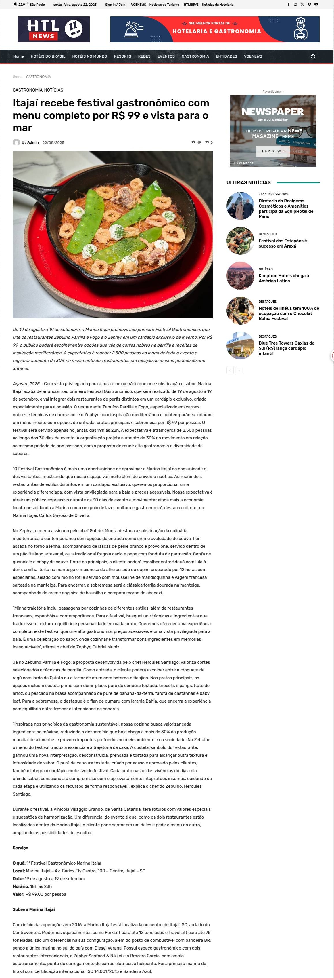 Itajaí recebe festival gastronômico com menu completo por R$ 99 e vista para o mar HTLNEWS - Notícias da Hotelaria e Gastronomia