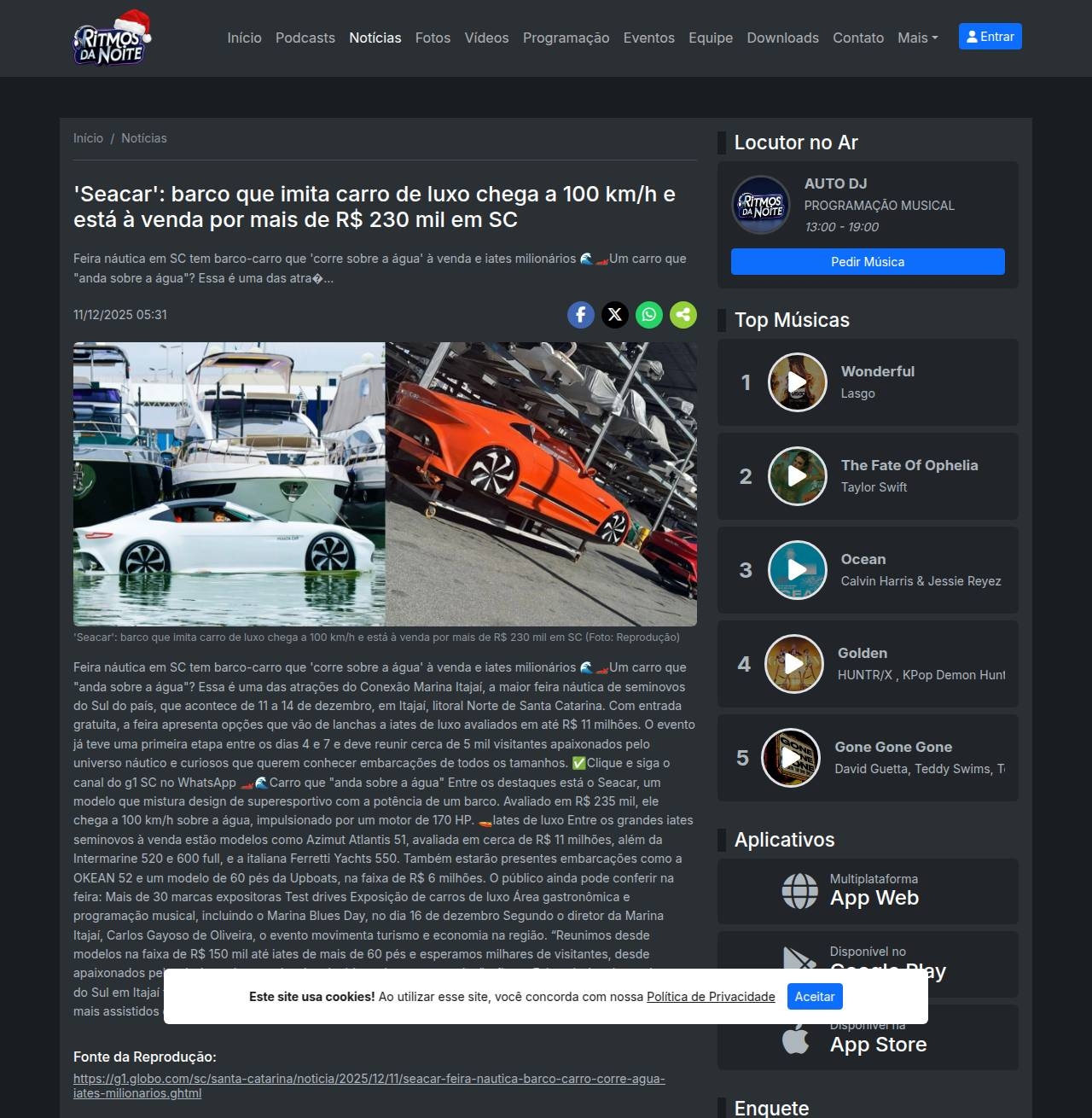 'Seacar': barco que imita carro de luxo chega a 100 km/h e está ŕ venda por mais de R$ 230 mil em SC Rádio Ritmos da Noite